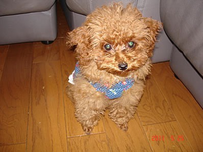 と無理なお願いをして引き取ってしまいました。そんないきさつから、5月14日に我が家にやって来たリボンは1月15日生まれの女の子、生後4ケ月です。犬種は明るく陽気なトイプードル、みなさんよろしくお願い致します。
