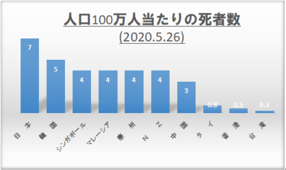 フィリピンの8人が省かれていますが、日本の7人というのはそれに次ぐ2位です。武漢ではあれほど悲惨な状況だったにもかかわらず、中国は3人です。もちろん、各国のデータを鵜呑みにはできませんが、欧米諸国に比べると軒並み2ケタ違います。